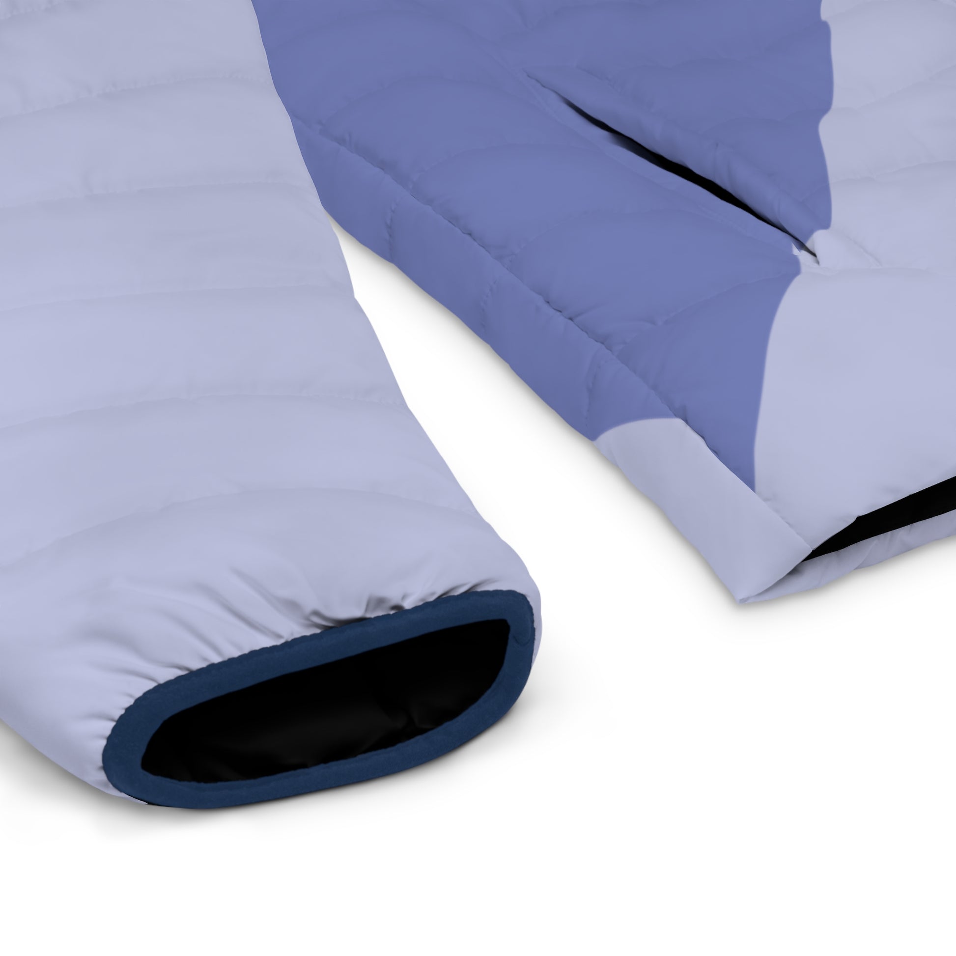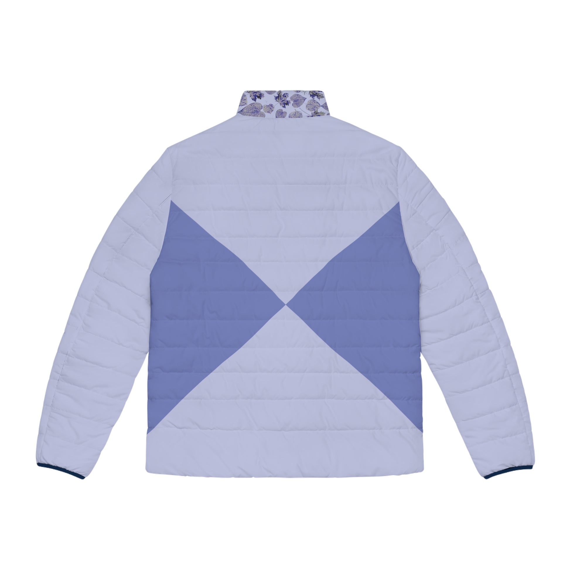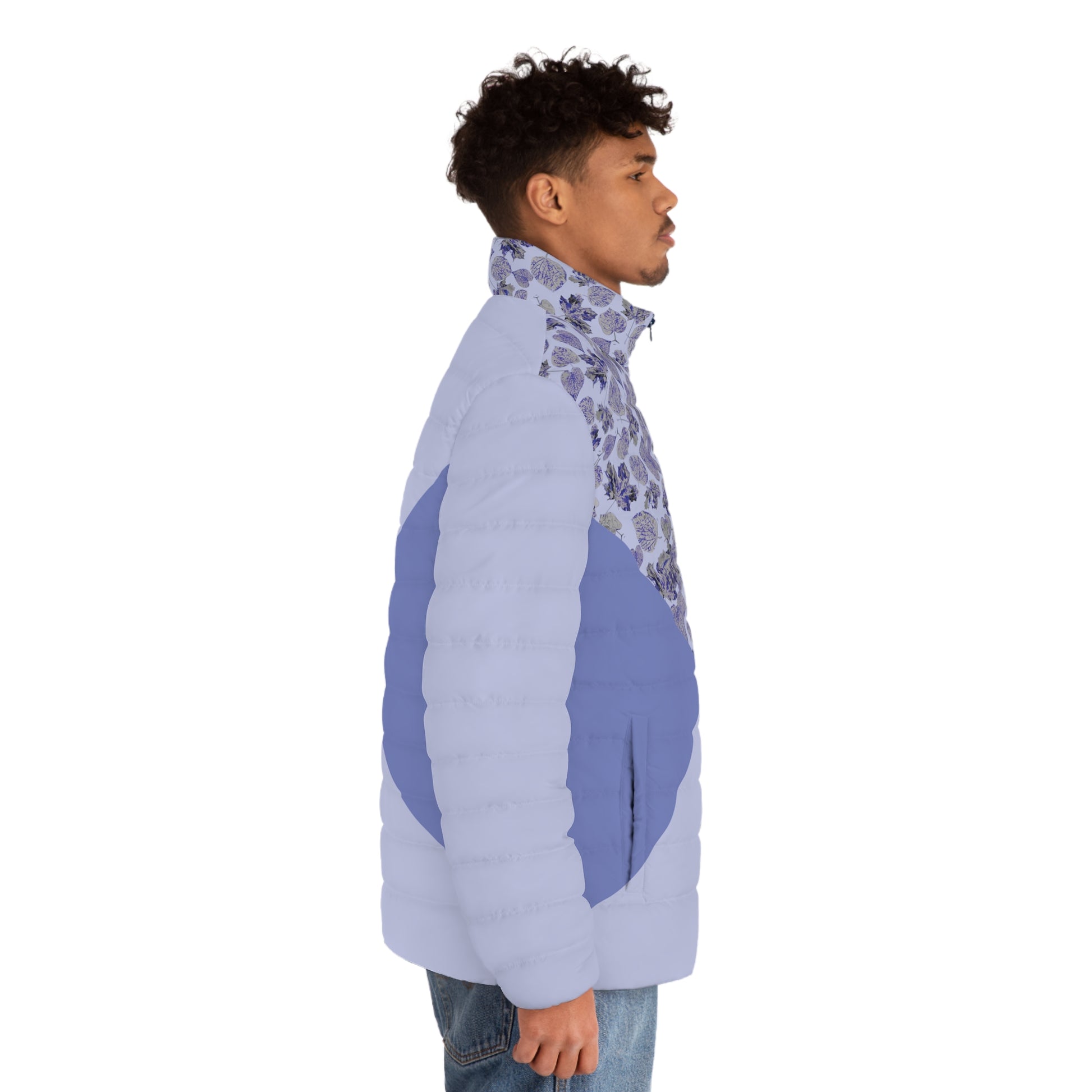 A stylish men's jacket with a double blue color and an asymmetric foliage design. This lightweight and soft to touch jacket is perfect for chilly weather and outdoor activities. The jacket features a black cotton-like lining for better comfort, moisture absorption, and quick drying. It also has two spacious front pockets, elastic cuffs for resilience, and a long-lasting high-quality plastic zipper with metal head. Suitable for men looking for a fashionable and functional outerwear piece.
