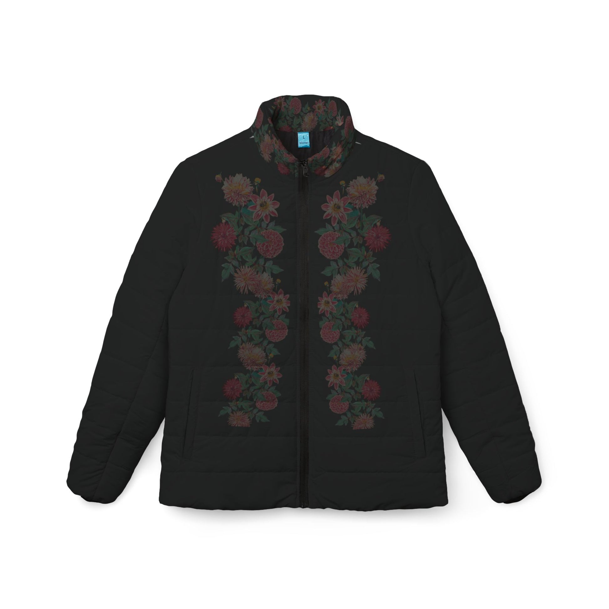 Stay warm and stylish with this women's puffer jacket featuring a beautiful dahlia cascade design. The vibrant colors and medium fabric weight make it perfect for layering in the colder months. Ideal for women looking to stay cozy and fashionable during the fall and winter seasons.