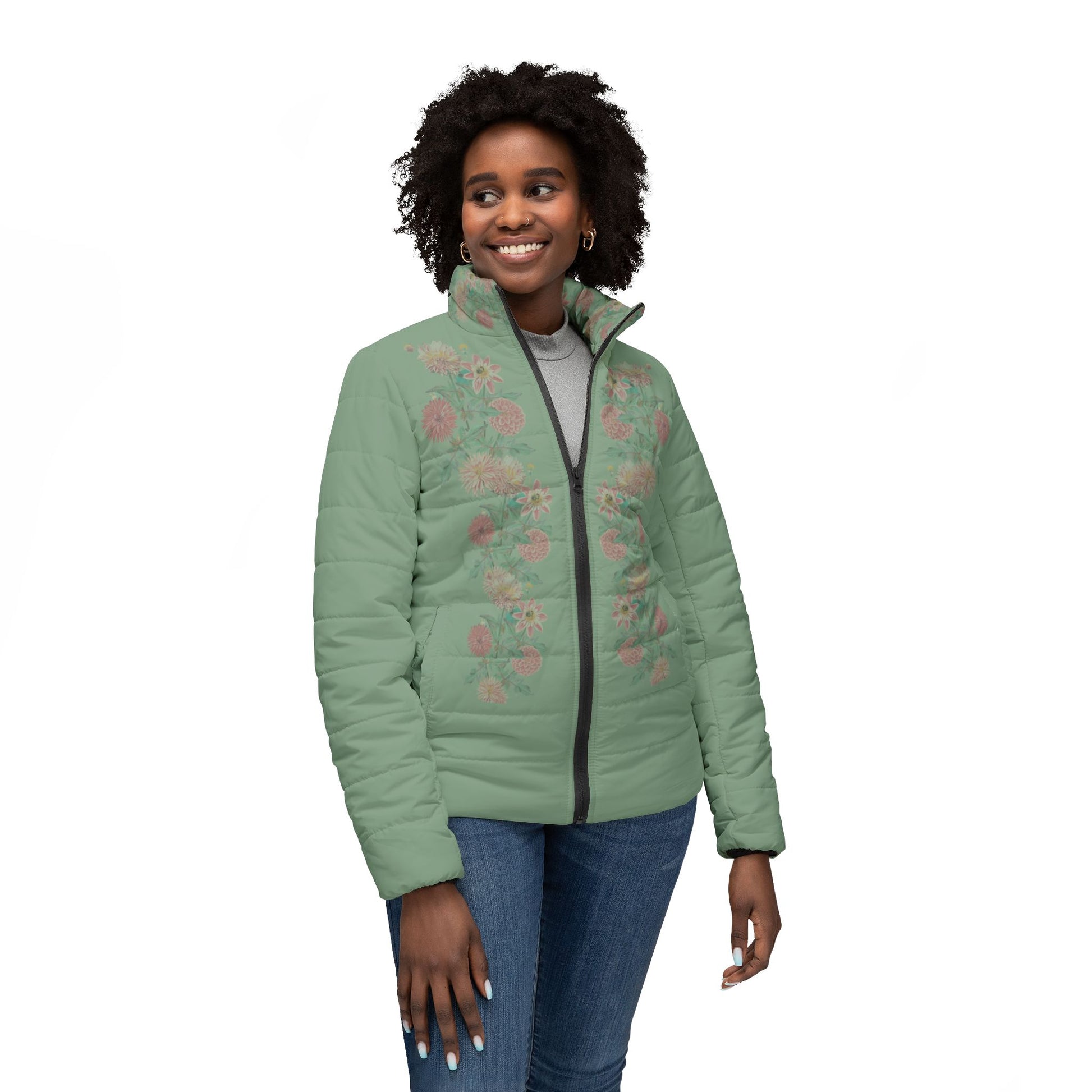 Stay warm and stylish with this women's puffer jacket featuring a beautiful dahlia cascade design. The vibrant colors and medium fabric weight make it perfect for layering in the colder months. Ideal for women looking to stay cozy and fashionable during the fall and winter seasons.