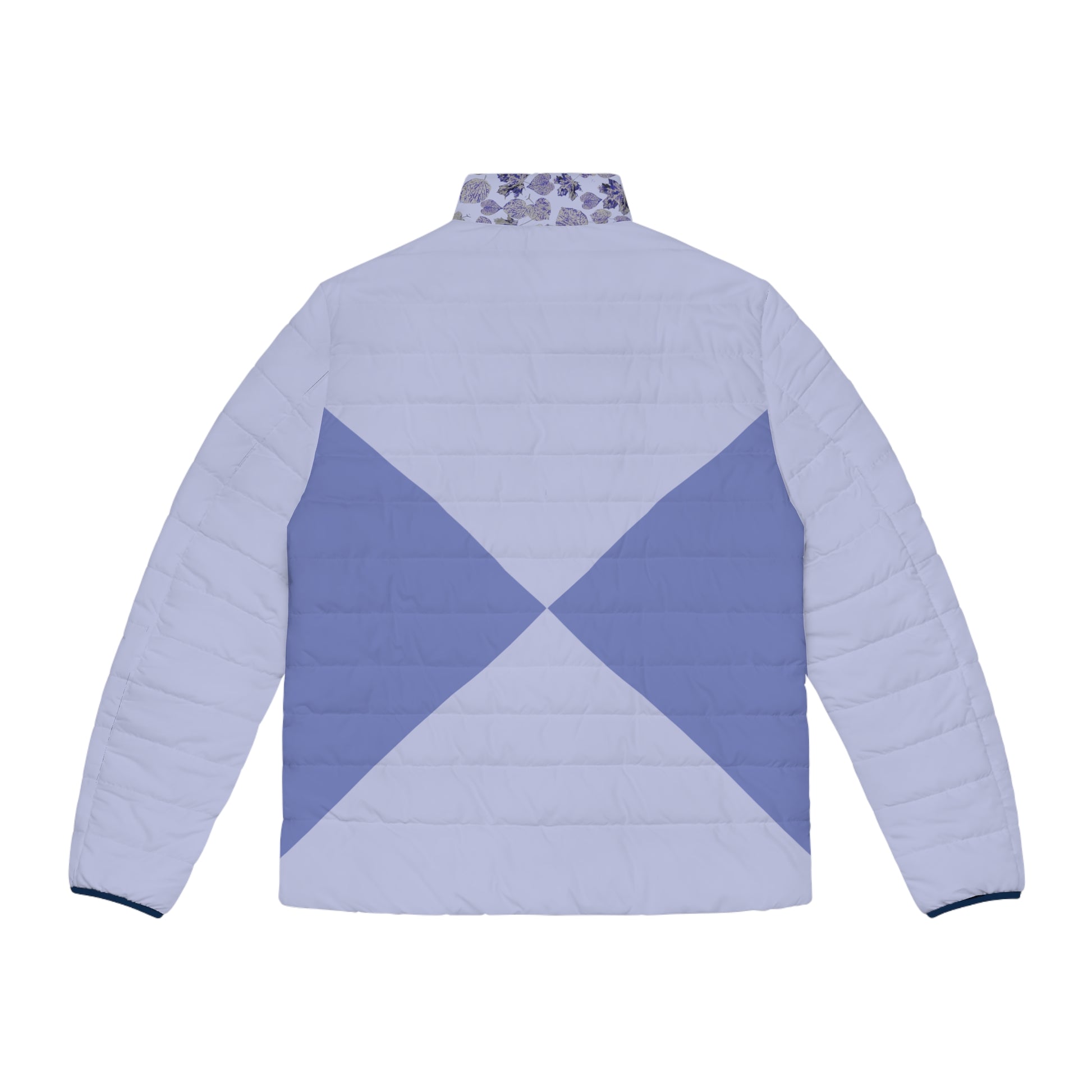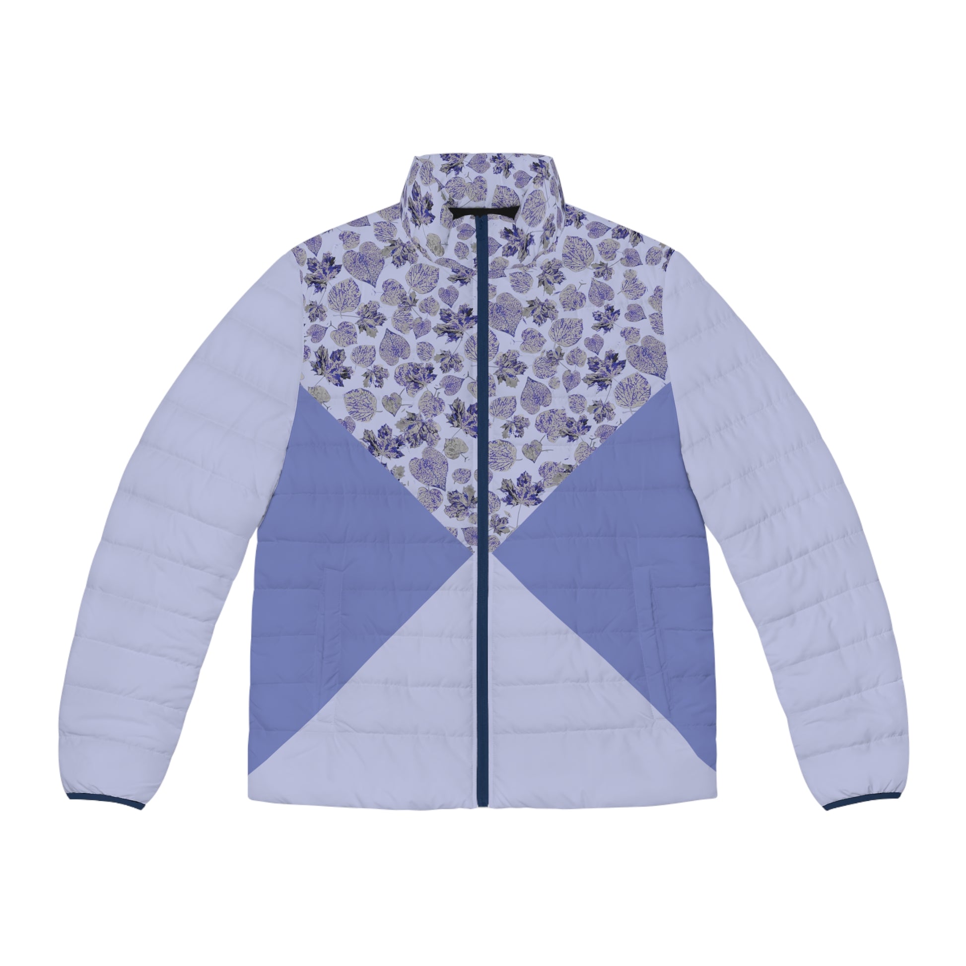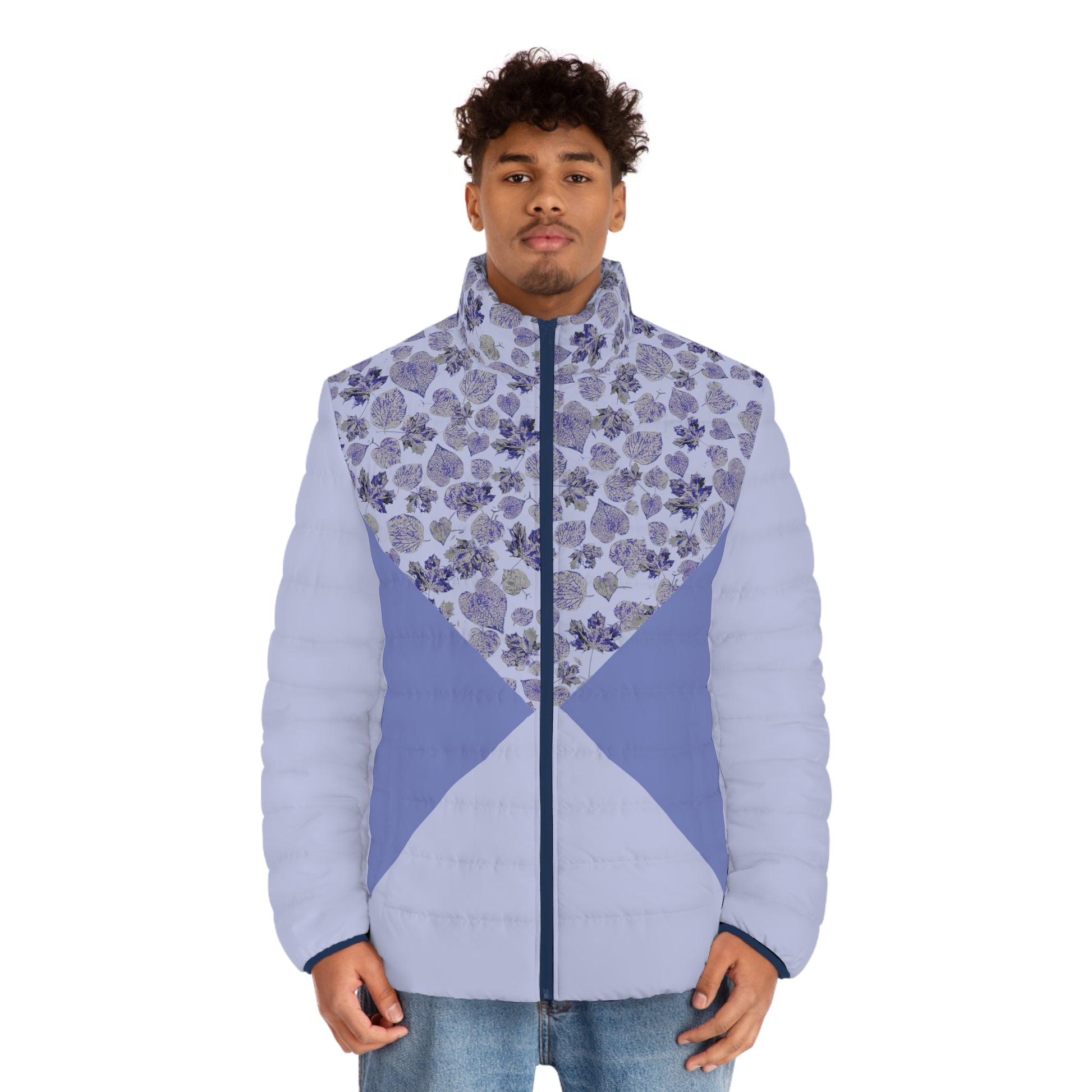 A stylish men's jacket with a double blue color and an asymmetric foliage design. This lightweight and soft to touch jacket is perfect for chilly weather and outdoor activities. The jacket features a black cotton-like lining for better comfort, moisture absorption, and quick drying. It also has two spacious front pockets, elastic cuffs for resilience, and a long-lasting high-quality plastic zipper with metal head. Suitable for men looking for a fashionable and functional outerwear piece.