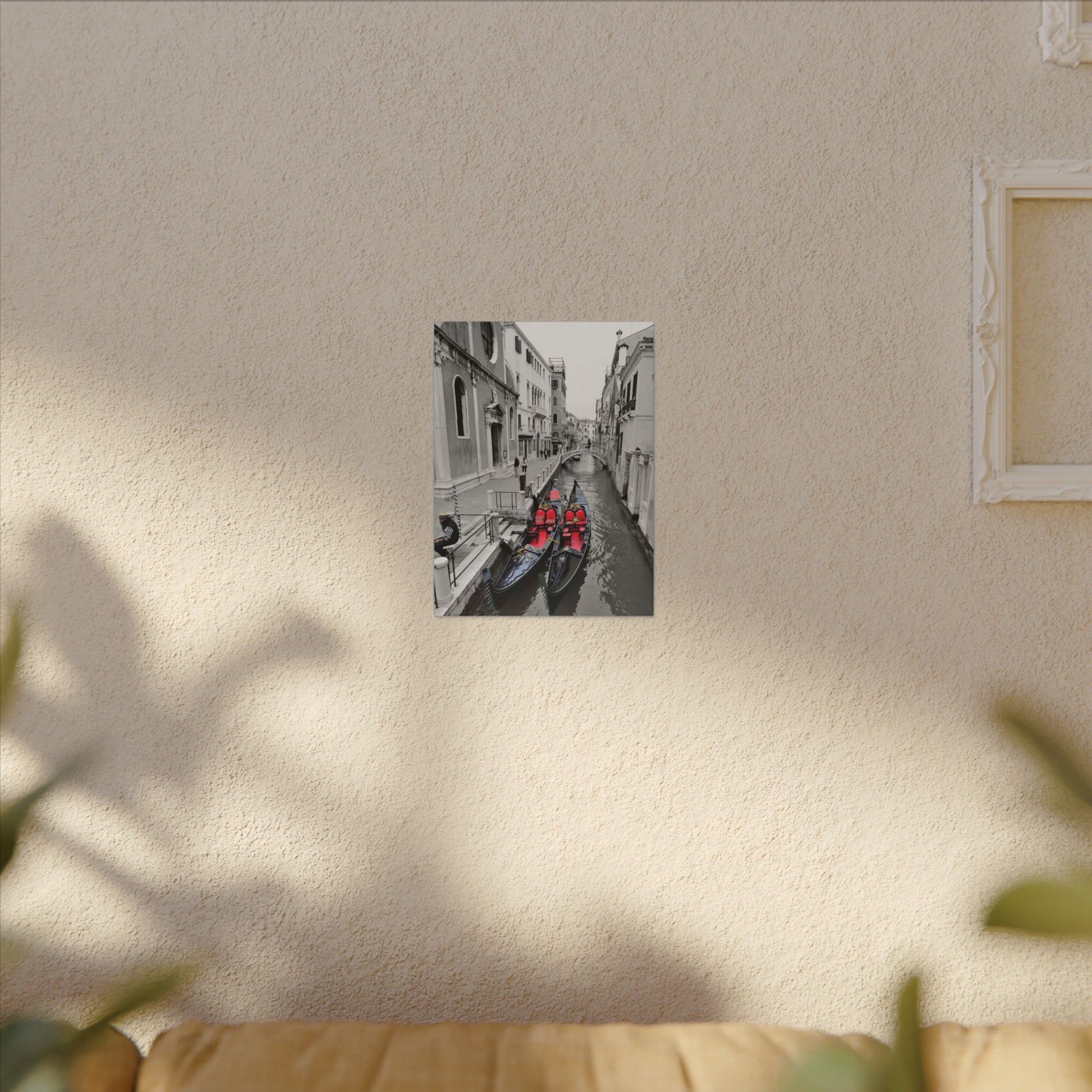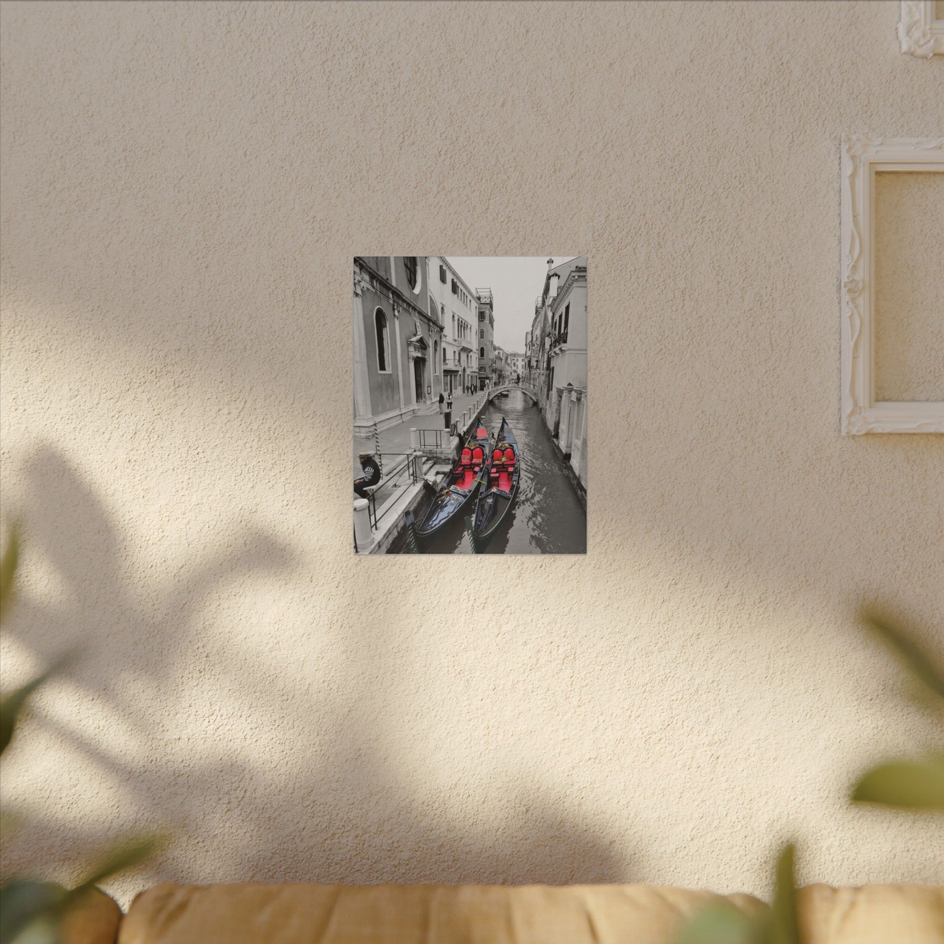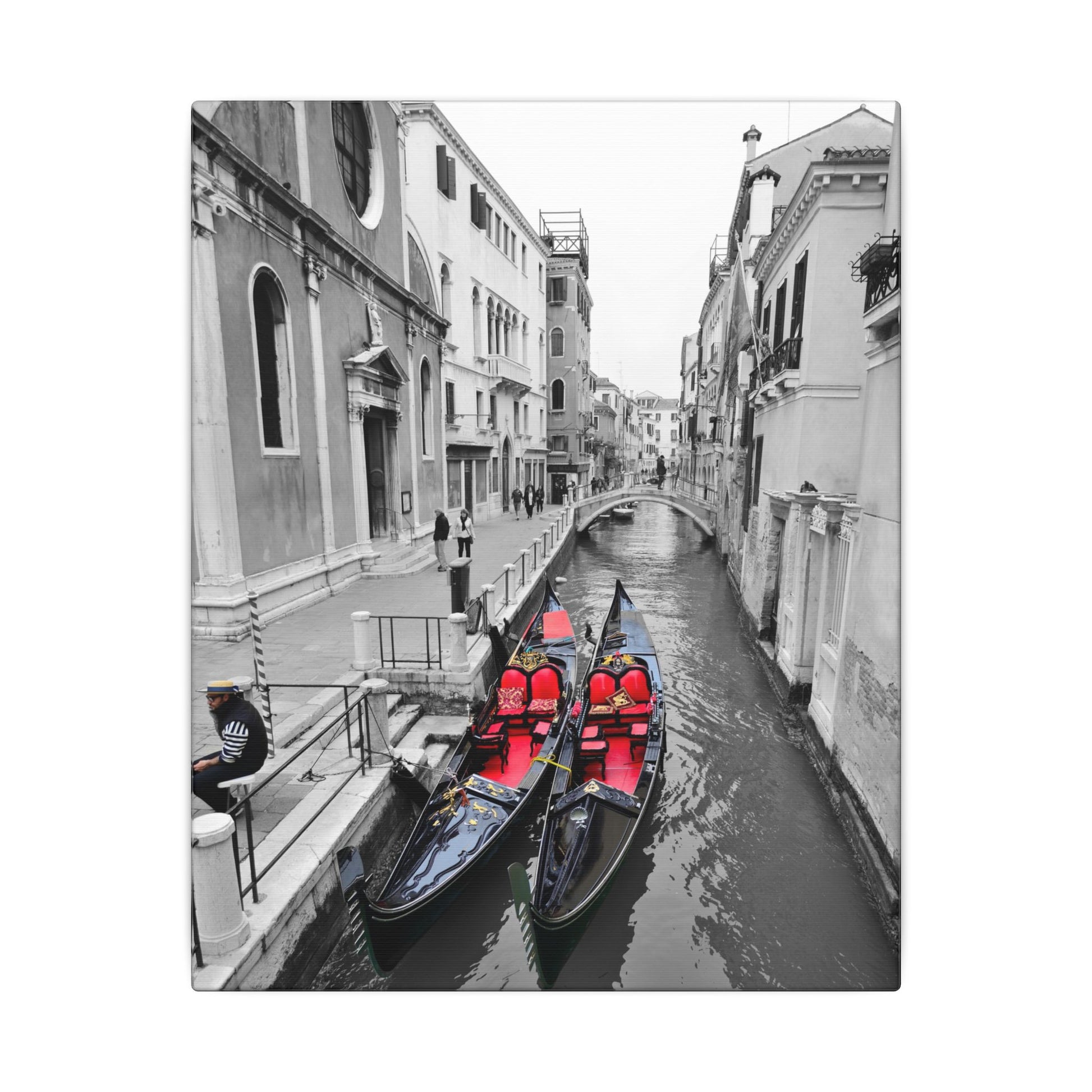 A striking matte gallery canvas that captures a poetic Venice moment: monochrome cityscapes punctuated by hand-colored gondolas and their gondolier. The contrast of velvety black-and-white streets and canals with the bright, carefully placed color draws the eye and holds attention — like finding a single painted postcard in an old album. Lightweight yet sturdy, the stretched canvas arrives ready to hang and anchors a room with quiet elegance. It sits beautifully above a mantel, in a narrow hallway, or in a study where slow travel and city memories are treasured. The subtle texture of the matte finish reduces glare and enhances depth, while responsibly sourced materials and non-toxic inks mean you can display it with confidence.